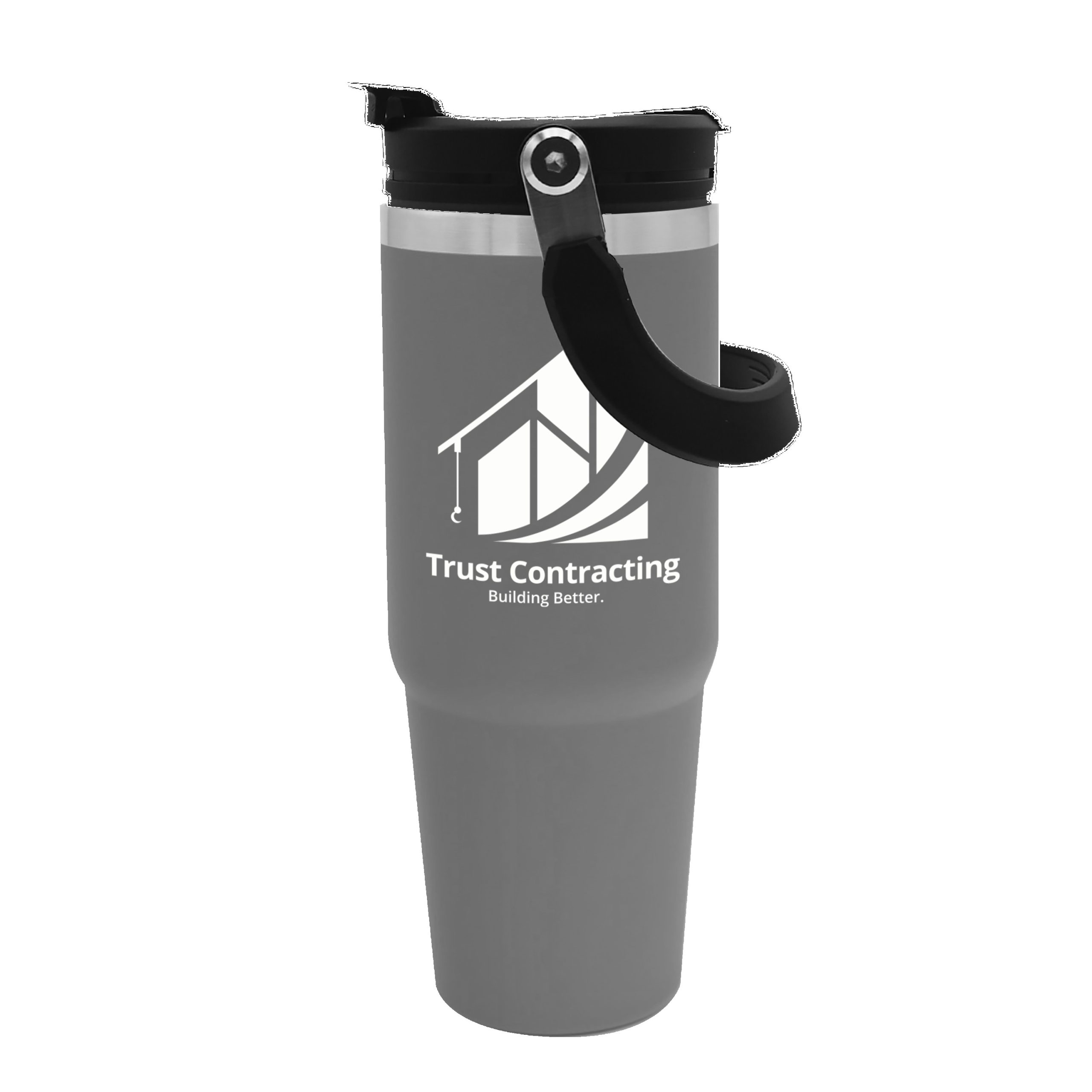Embark on your next adventure with this 30 oz. stainless steel tumbler. Its double-wall construction keeps beverages hot or cold for hours, while the fold-down handle makes it easy to grab and go. The screw-on, spill-resistant lid lets you choose your sip style with both a flip-up straw and drink-through opening. Durable, functional, and ready for any journey, this bottle is built to keep up wherever life takes you. Complies with Prop 65. 3.5″ W x 9.5″ H x 3.5″ D